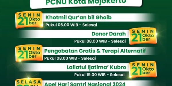 Dalam rangka memperingati Hari Santri Nasional 2024, Pengurus Cabang Nahdlatul Ulama (PCNU) Kota Mojokerto menyelenggarakan serangkaian kegiatan bermanfaat yang akan berlangsung mulai 21 hingga 26 Oktober 2024. Dengan tema “Menyambung Juang, Merengkuh Masa Depan”, kegiatan ini mengajak seluruh masyarakat untuk…